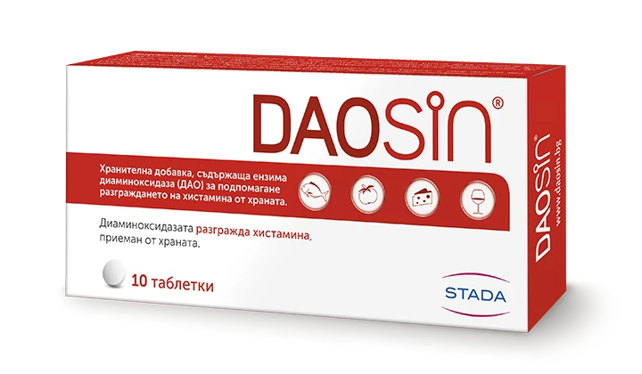 Отказали ли сте се от храните, богати на хистамин? DAOSiN® е хранителна добавка с ензима диаминоксидаза (DAO), който подпомага разграждането на хистамина от храната в червата.